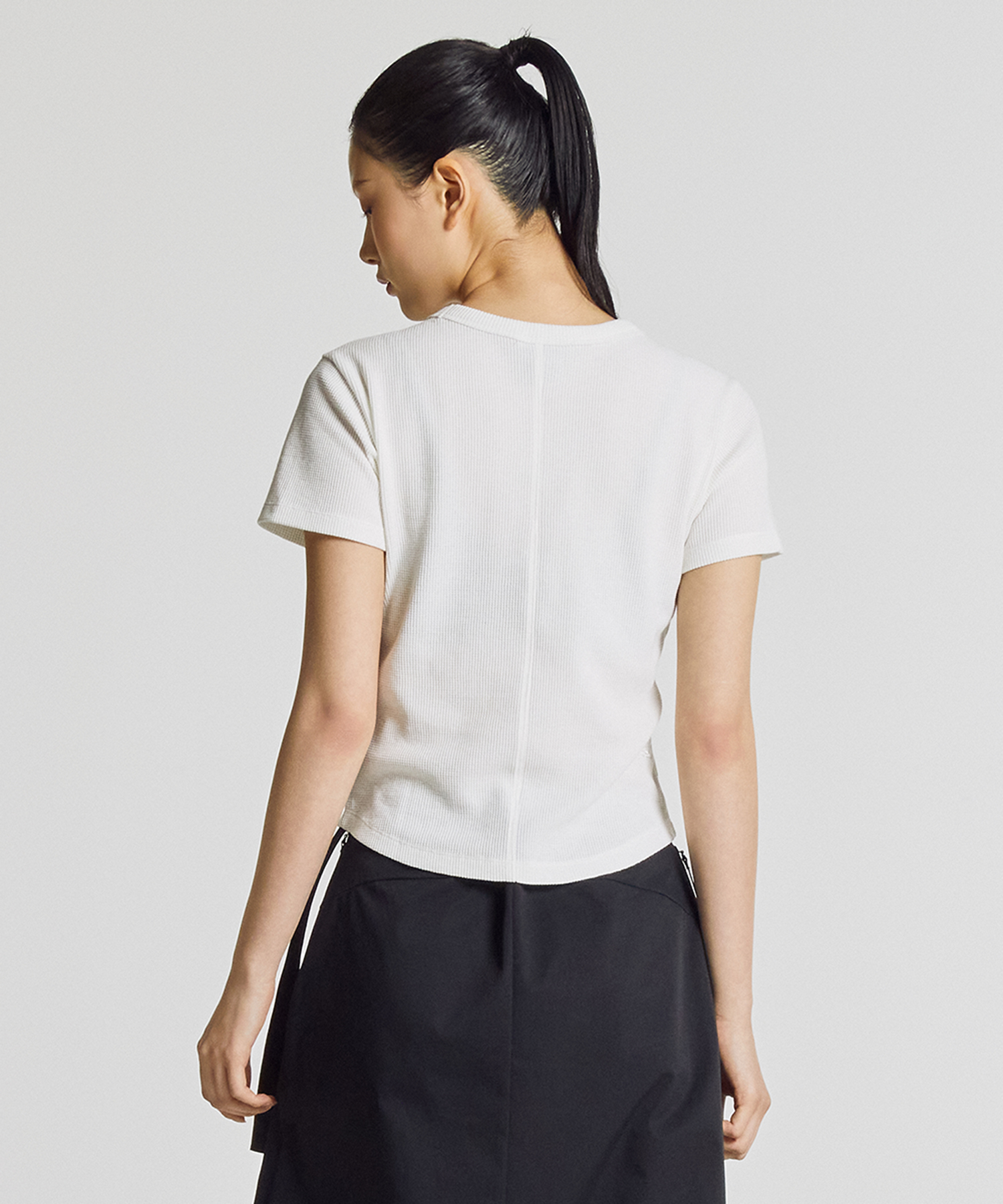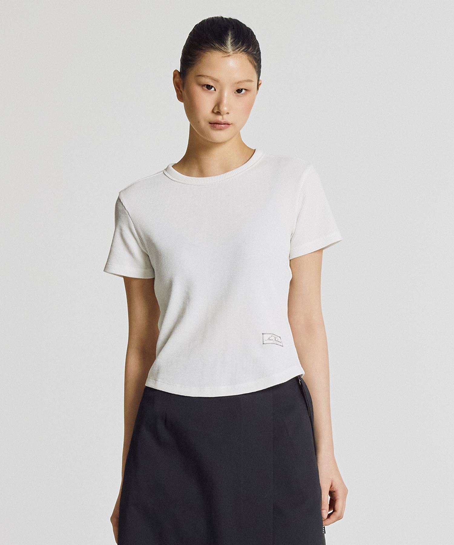 세미크롭 기장의 슬림핏 반팔티로