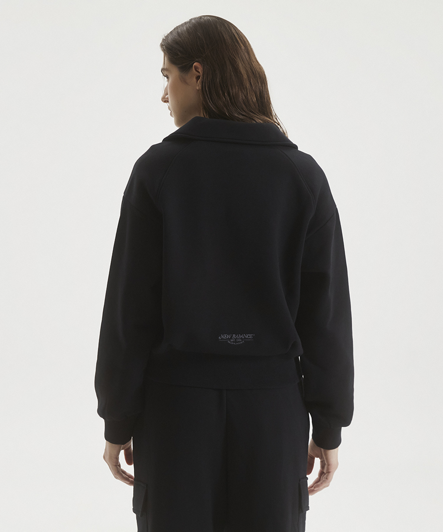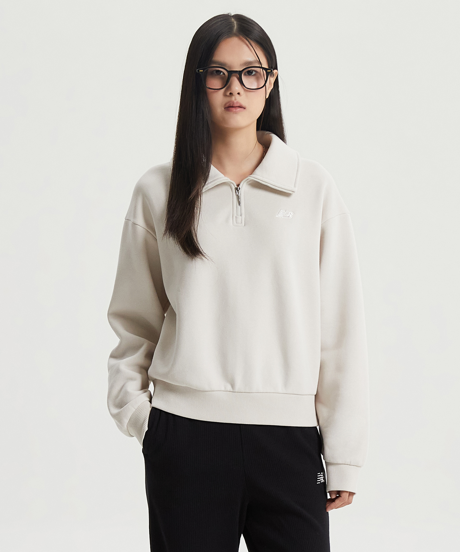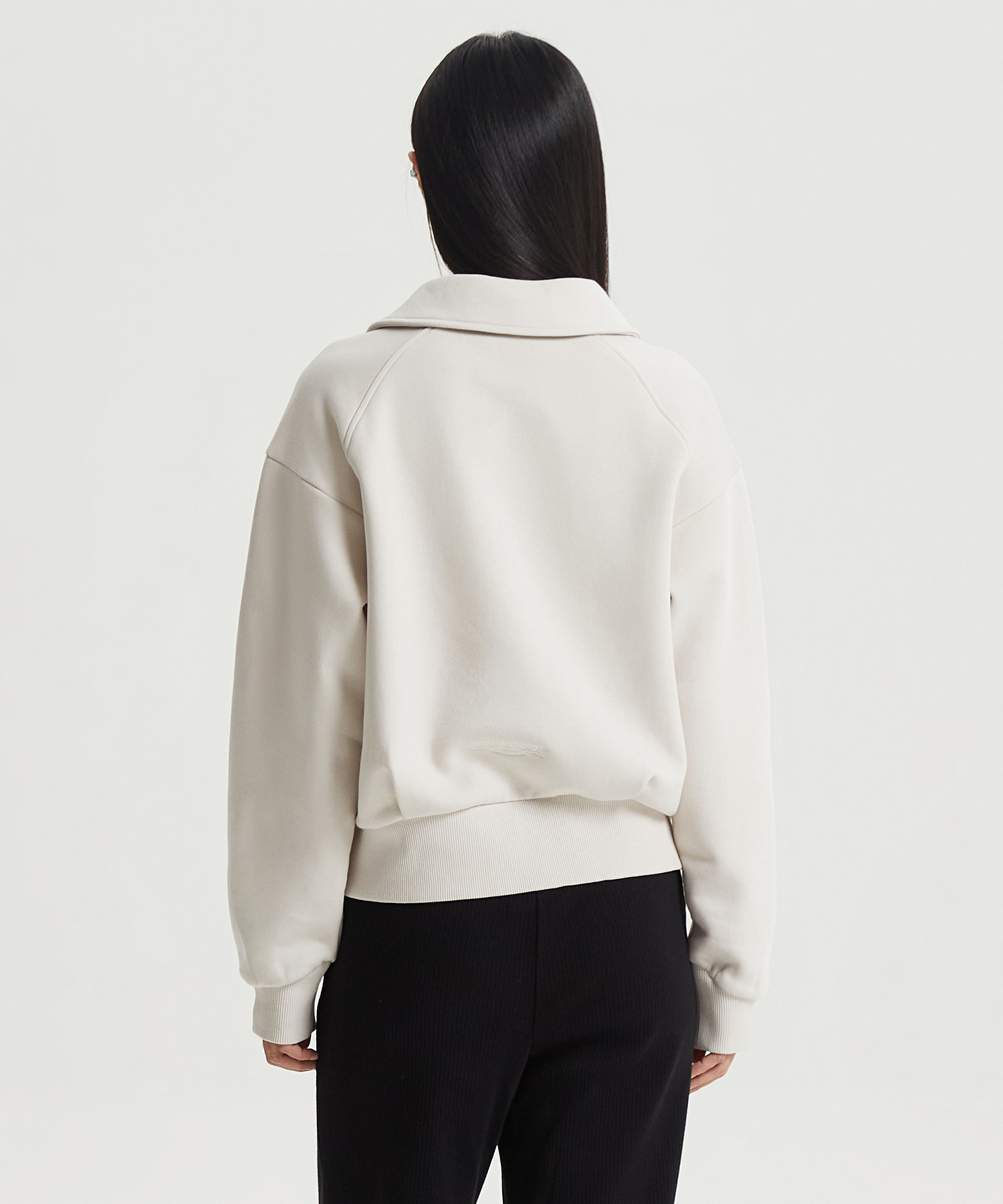 직자수 플라잉 로고 사용한 우먼스 에센셜 기모 반집업 맨투맨입니다