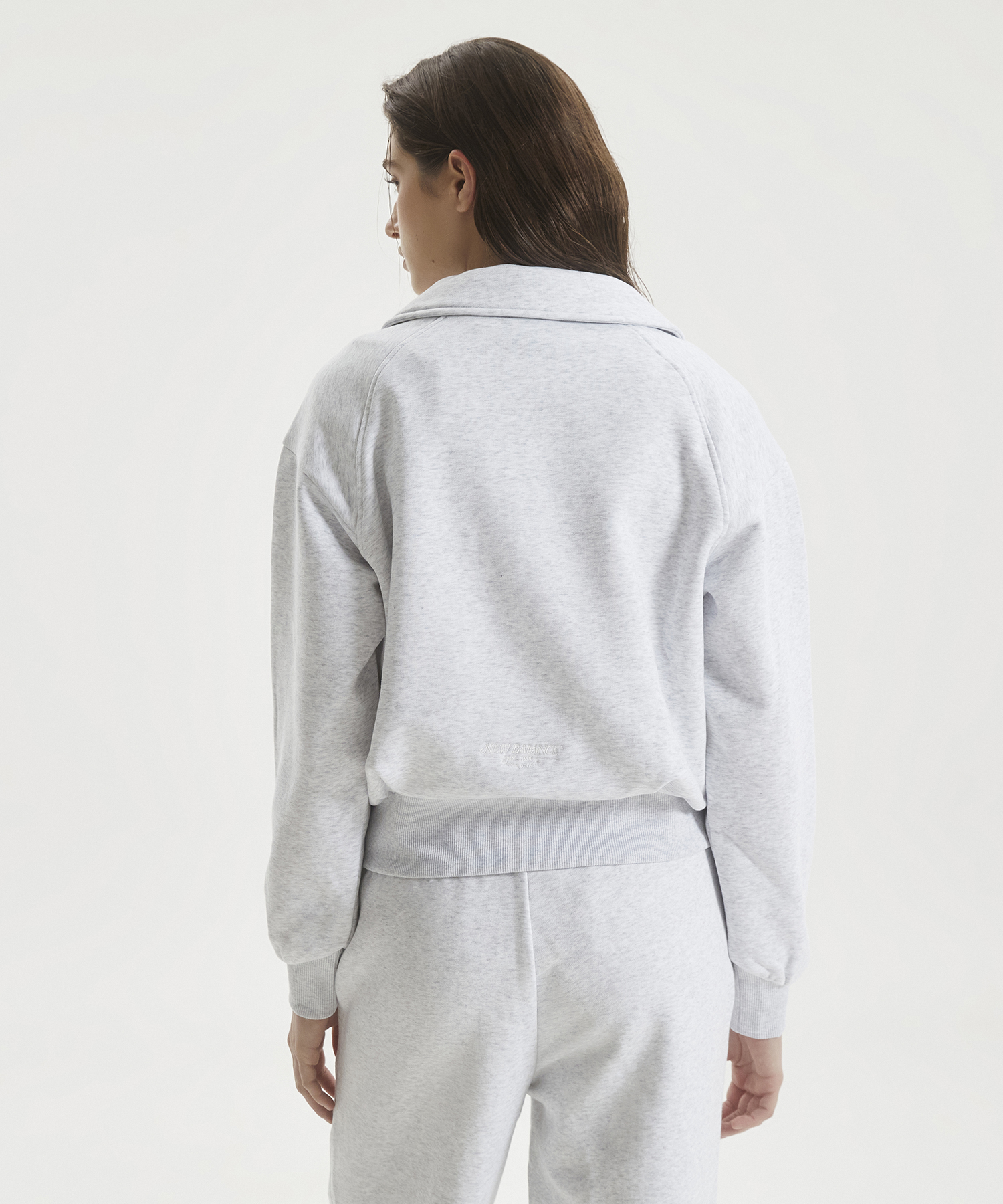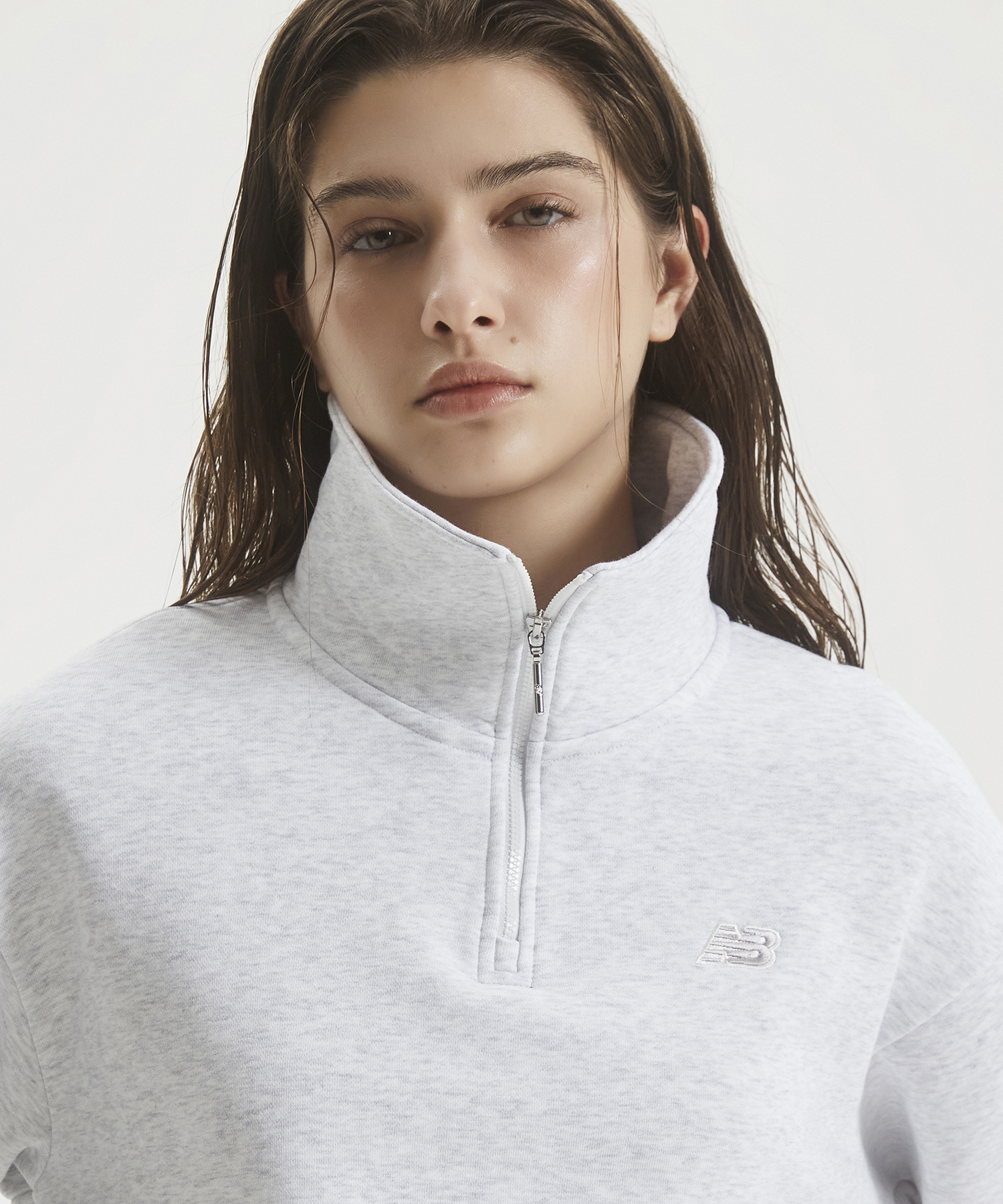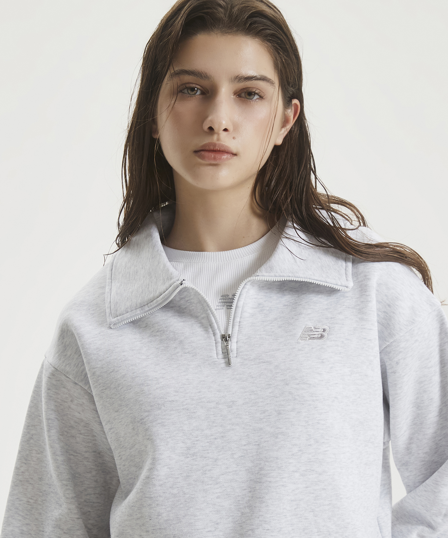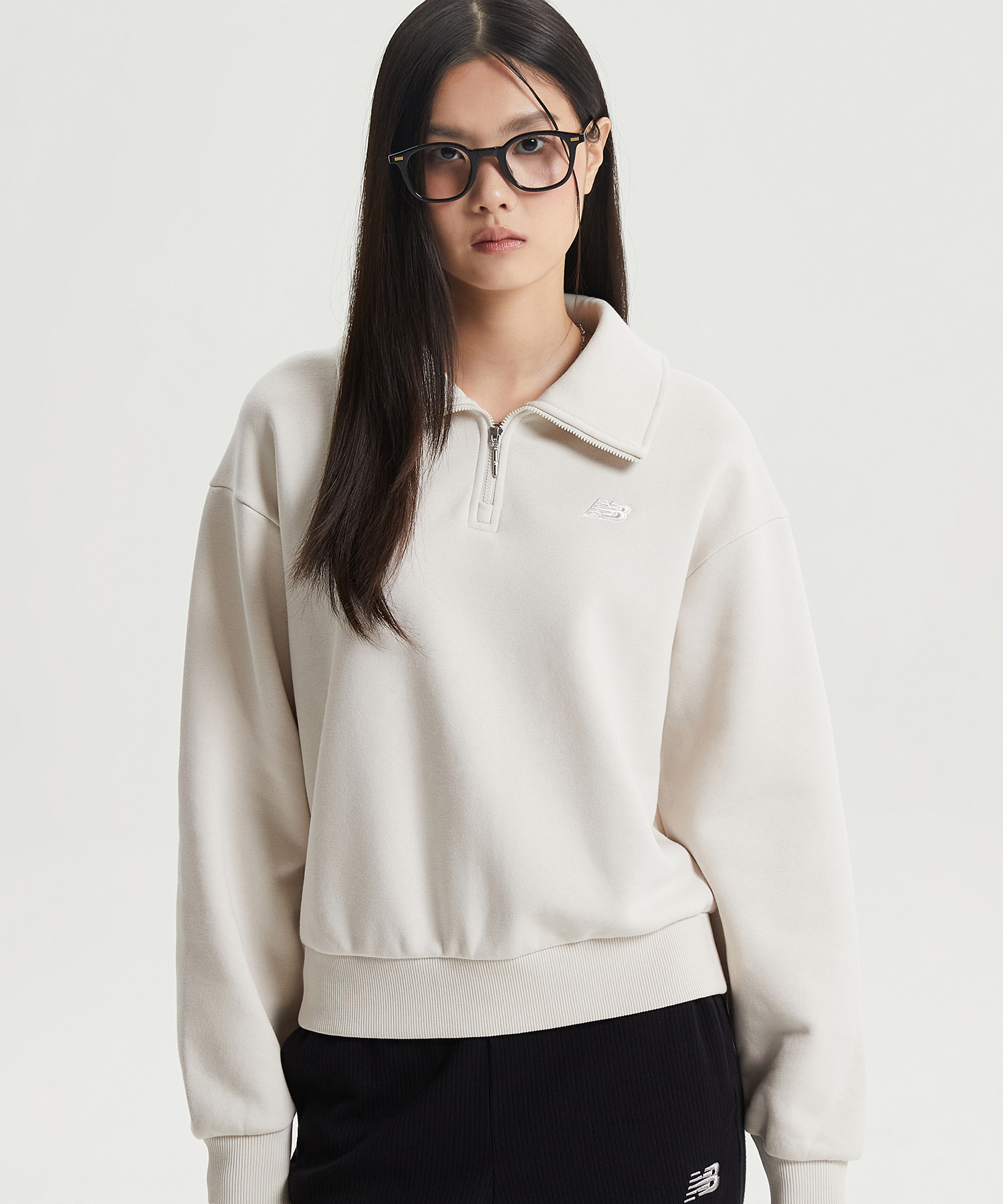 직자수 플라잉 로고 사용한 우먼스 에센셜 기모 반집업 맨투맨입니다