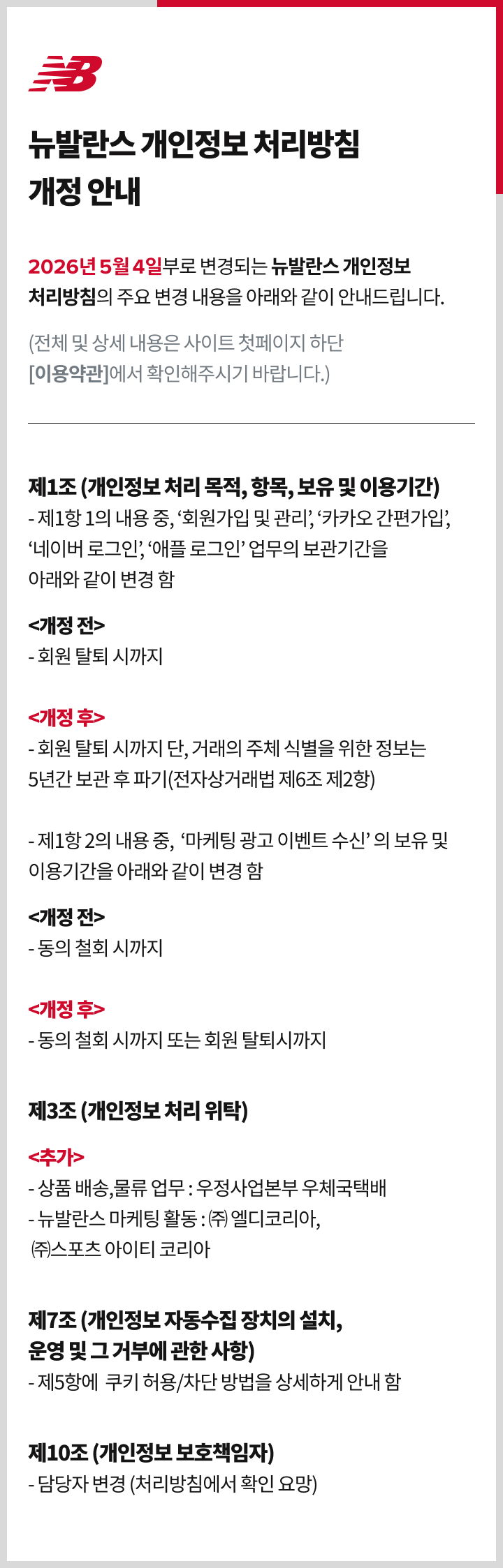 뉴발란스 공식 온라인스토어내의 모든 콘텐츠는 [콘텐츠산업 진흥법]에 따라 제작일 또는 그 갱신일로부터